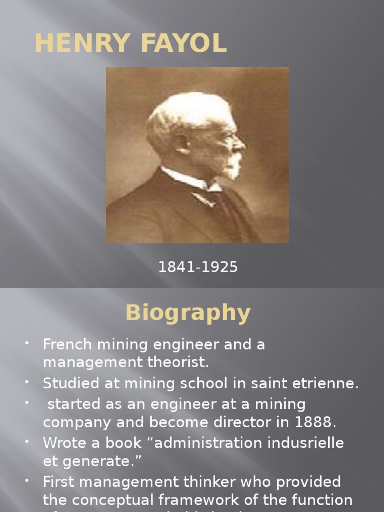 Henri Fayol was a French industrialist and manager working in the mine industry and looking for applicable solution to business management. Henri Fayol July 29 1841 November 19 1925 Engineer and theorist of business administration. It was based on his experience managing a successful business.